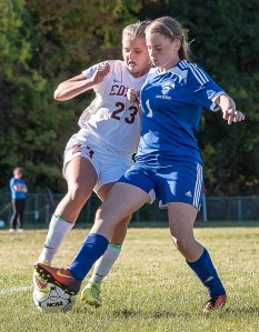 EL’s Piper Norcross tested Lewiston goalie Kallie May (seven saves) a couple of times in the second half, including a deep bender that somehow eluded May’s left hand but had a little too much break on it to settle inside the right post with seven minutes left in regulation.