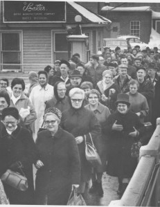 Rachel Desgrosseilliers recalls the many reflections from locals, about waiting and waiting for a family member, neighbor or friend after their shift, as it took upwards of an hour for all the workers to cross the small bridges over the canal from the mill. Her own Uncle Alphee worked 40 years as a weaver and is seen in the image with pipe in mouth. Several women visiting the museum last year, noted with surprise that their mother was in the forefront of the image – wearing a coat with big buttons “Mama, was so proud of that coat she made and we especially admired those huge buttons….”
