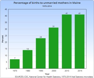 In 2013, 41 percent of births in Maine were to unmarried women.