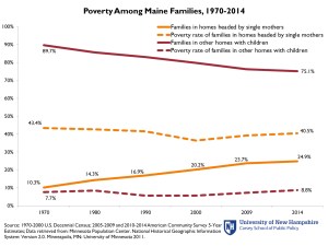 The poverty rate for Maine families in 2014 would be 27.8 percent lower if the share of families headed by single mothers remained at the 1970 level, according to researchers at the University of New Hampshire’s Carsey Center for Public Policy.