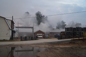The chief said the woodworking plant has a sprinkler system that “kept the fire intact” while the firefighters drove to the scene.