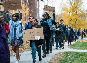 “Black Lives Matter” was the most common one, but students also loudly proclaimed, “Love trumps hate,” and, “We are unstoppable. Another world is possible.”