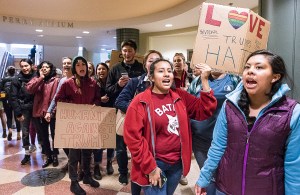 Seven days later, with the chalk fading, more than 400 students gathered to bemoan Donald Trump’s presidential victory and vowed to fight for their ideals in what they fear could prove a dark time.