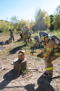 The students began their day by donning and doffing the heavy firefighter gear and were introduced to the self-contained breathing apparatus. They were split into two companies and kicked off the activities with a wood-splitting competition. The split wood was later raffled and went to a man in Peru who needed firewood, Longley said.
