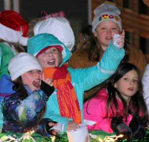 These youngsters show their excitement aboard one of the floats during the Christmas in the Valley Parade Friday night in Rumford.