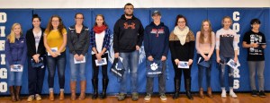 Dirigo High School students have earned a classroom award for the month of November. They are, from left, Carly Welch for chemistry; Elizabeth Gallant, French III; Katelyn Ellis, Spanish III; Shelby Shurtleff, bridge chemistry; Ashley Perreault, health; Nathan Cloutier, English; Bryce Whittemore, creative writing; Haley Holland, senior English; Cheyenne Cyr, AP government; Alexis Holman, science; and Riley Dumont, U.S. history. Absent is Michael Cole, who was given an award for alternative education.