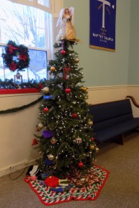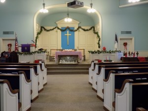 Members of the congregation have adorned the sanctuary with greenery, a large Nativity and several other Christmas scenes. Antique lanterns have been placed on the windowsills. Wreaths adorn the windows.