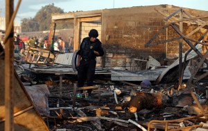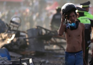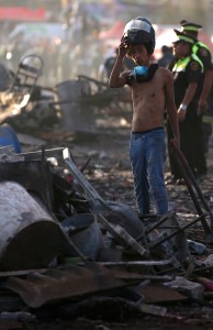 Sirens wailed and a heavy scent of gunpowder lingered in the air well after the thunderous explosions at the market, which were widely seen in a dramatic video. The smoking, burned out shells of vehicles ringed the perimeter, and first responders and local residents wearing blue masks over their mouths combed through the ash and debris. Firefighters hosed down still-smoldering hotspots.