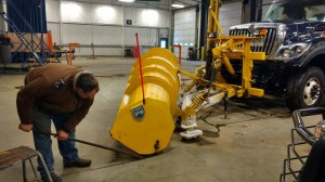 Where the plow attaches to the frame, there are three heights it can be inserted into. The lowest hole, Meisner said, the crew never uses. The second hole is for “normal” plowing, and the third hole is used to help the plow achieve “a more aggressive angle,” so the roads can be scraped down to the tar.