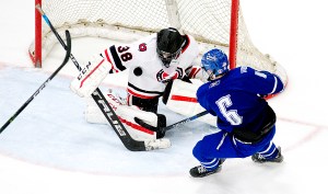 One minute after the Red Storm penalty expired, the Blue Devils went end to end to score again. Cody Doyon and Luc Dostie broke out for a 2-on-1, with Doyon’s shot from the left getting blocked by Wasser before Dostie put the puck into an open net on the rebound with 2:33 left in the period.