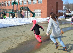 FARMINGTON — Volunteer Hailey Jarvis chased first-grader Ruby Alexis in a game of tag Thursday during recess at the Mallett School.