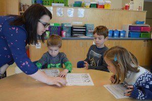 In Emily Schanck’s kindergarten class, volunteer Allicia Hilton worked with students Isaac Reynolds, Bowen Lawless and Irelynn Kangas.