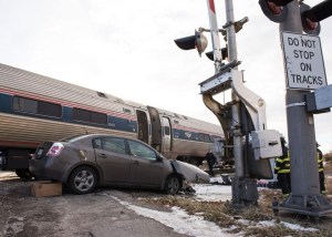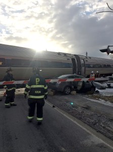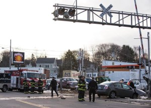 The Boston-bound Downeaster, train No. 682, was able to stop quickly, but the front end of the Nissan was hit as the sedan was pushed away from the tracks. The vehicle came to rest just off Brighton Avenue in front of the crossing gate.