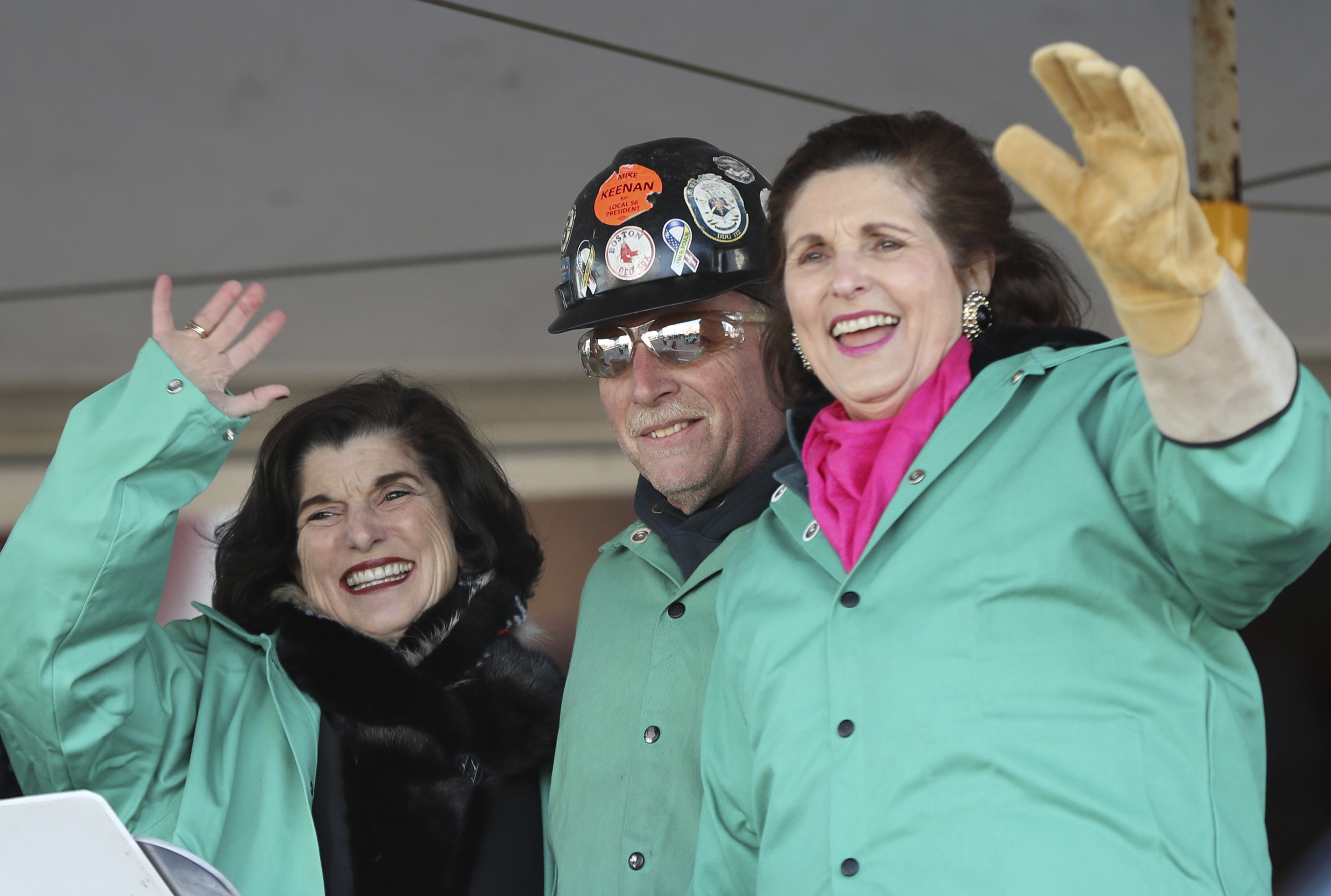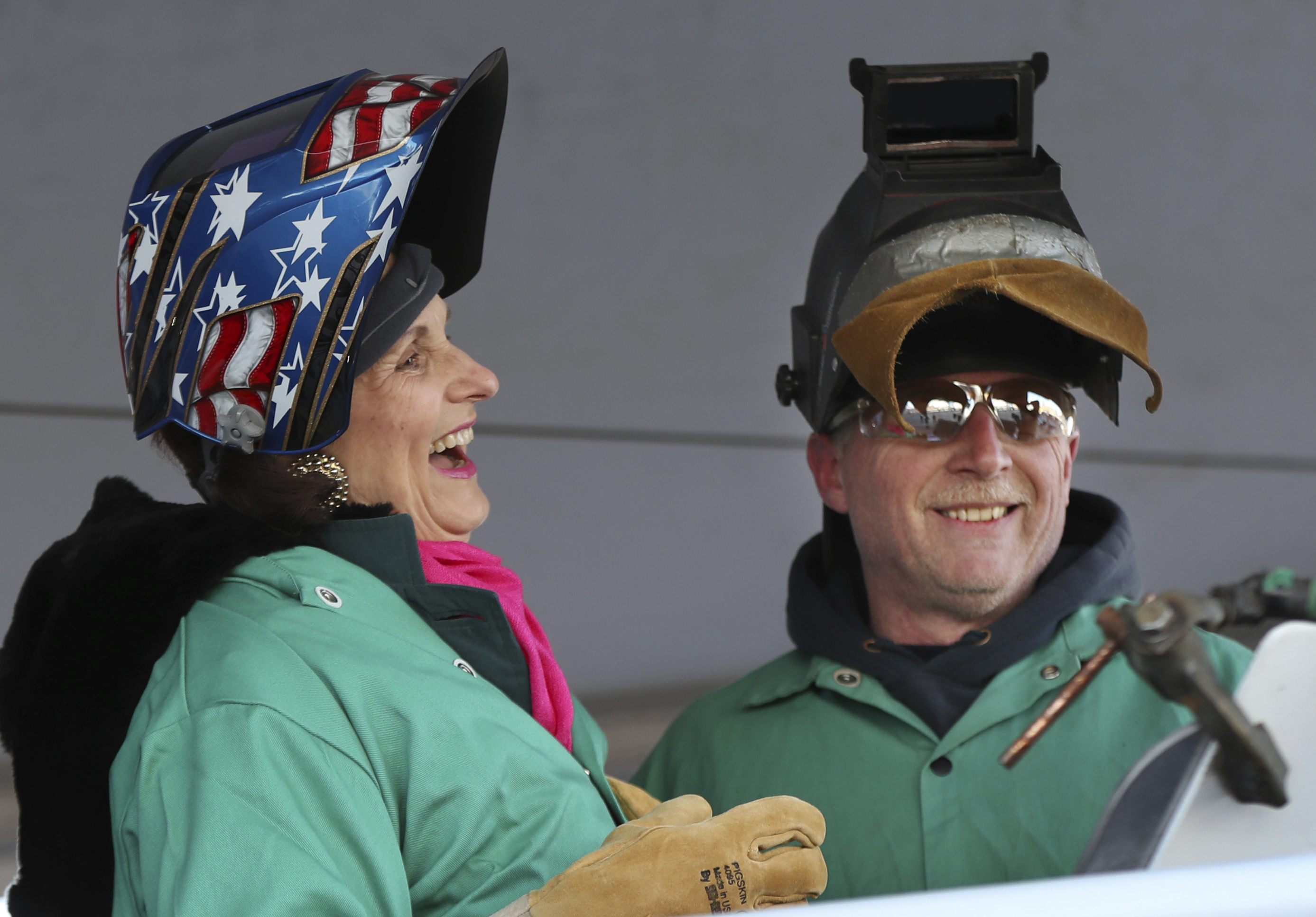 Wearing welder helmets, Lynda Bird Johnson Robb and Luci Baines Johnson were assisted by shipbuilder Timothy Trask in welding signatures on a steel plate during a keel-laying at the ceremony at Bath Iron Works.