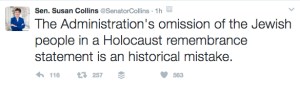 Sen. Susan Collins of Maine said over Twitter that “The Administration’s omission of the Jewish people in a Holocaust remembrance statement is an historical mistake.”