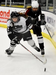 Three-and-a-half minutes later, following a Greely penalty for too many skaters on the ice, Lutryzkowski intercepted a a pass on her own blue line and carried it deep into Rangers territory. With a one defender to beat, she dumped her pass off to Cornelio and she squeezed the puck past Todd for the second goal of the game.