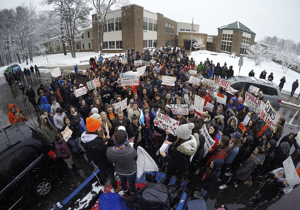 Students at Yarmouth High School participate in a walkout to protest gun violence, Wednesday, March 14, 2018, in Yarmouth. Leaders of the rally address the crowd from the back of a pick-up truck in front of the school. Yarmouth is one of the few schools in Maine that did not cancel school on Wednesday as the state digs out from the third major winter storm in two weeks. (AP Photo/Robert F. Bukaty)