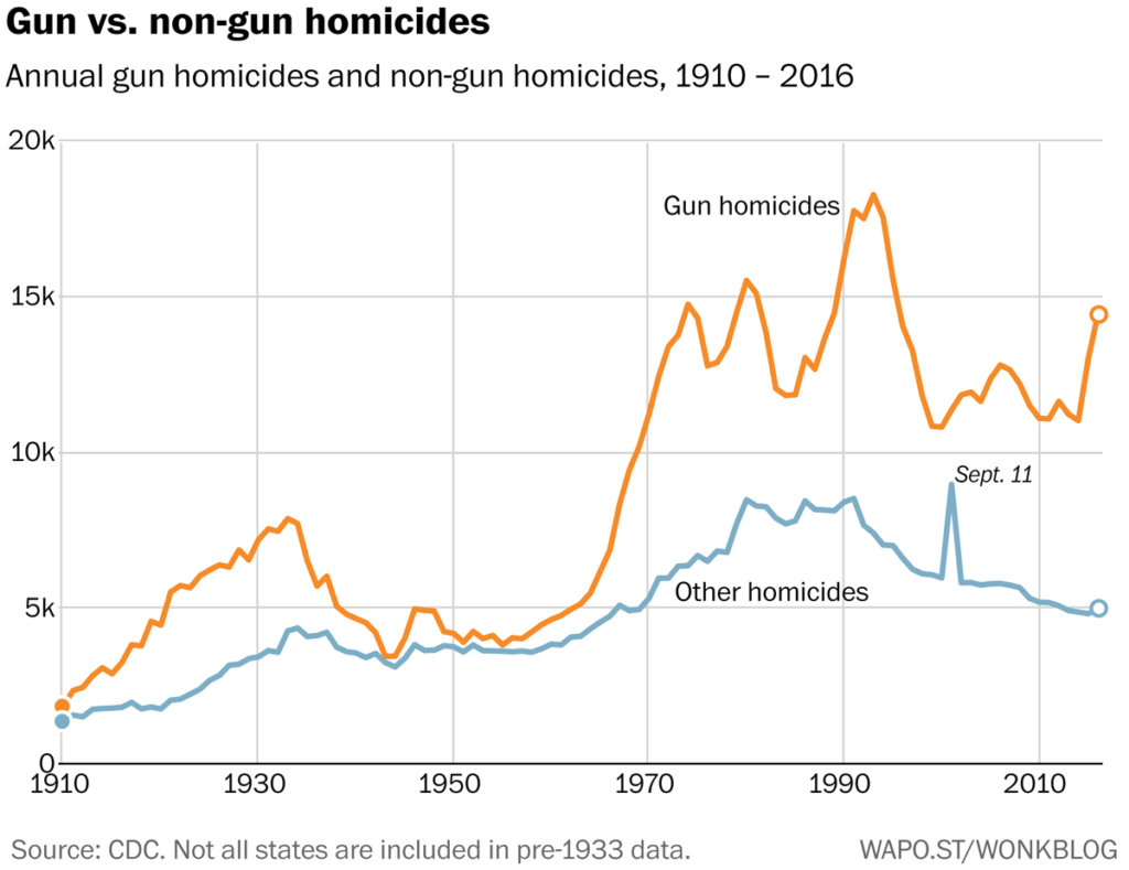 The data show that gun homicides have always surpassed homicides by other means – stabbing, strangulation, etc. – in number. In some years, like in the 40s and 50s, this gap is fairly small (note also the spike in non-gun homicides in 2001, the year of the Sept. 11 terrorist attacks). But in other periods, like the 20s, 30s, and the latter half of the 20th century, the number of gun homicides soars relative to the number of other homicides.