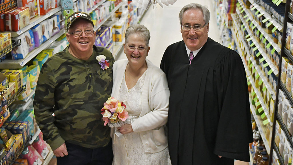 The judge who performed the ceremony said it was his first wedding at a grocery store. Store owner George Thimons said he was glad to accommodate the couple.