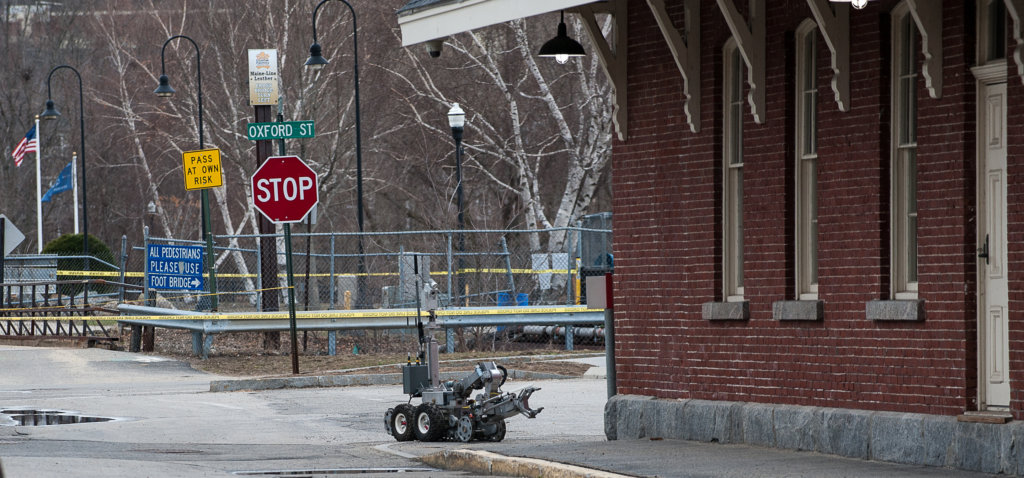 A short time later the bomb team sent their robot to investigate the device. It was moved a few feet away from Rails and, at about 5:30 p.m., destroyed with the water cannon. There were a few gasps from the crowds standing around to watch, but it became clear fairly quickly that the explosion had been controlled.