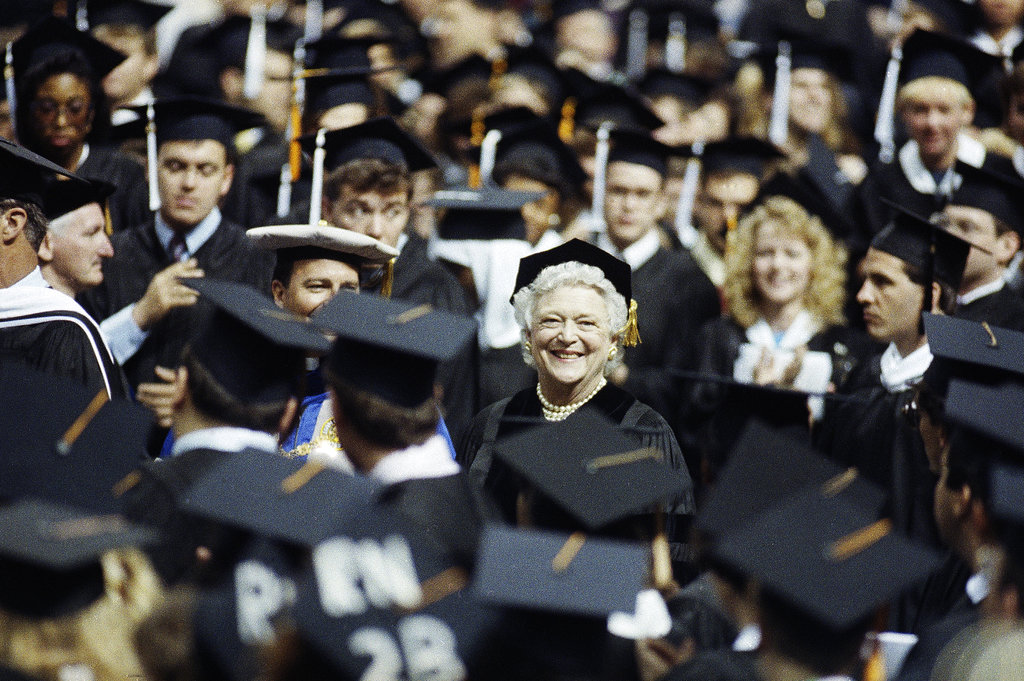 FILE – In this May 19, 1990, file photo, first lady Barbara Bush, center, smiles while being greeted by graduates at St. Louis University in St. Louis, Mo. A family spokesman said Tuesday, April 17, 2018, that former first lady Barbara Bush has died at the age of 92. (AP Photo/James A. Finley, File)