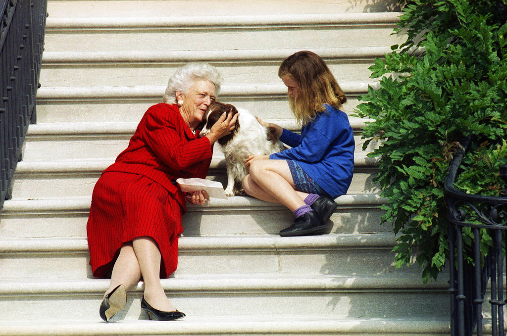 FILE – In this Sept. 13, 1991, file photo, first lady Barbara Bush, her granddaughter Barbara, and Millie wait on the steps of the White House for U.S. President George H.W. Bush to return from his check-up at Bethesda Naval Hospital in Washington. A family spokesman said Tuesday, April 17, 2018, that former first lady Barbara Bush has died at the age of 92. (AP Photo/Barry Thumma, File )