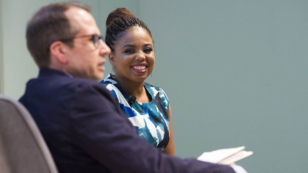 Jemele Hill, right, smiles during an introduction by Justin McCann prior to her” Freedom to Speak: A Conversation with Jemele Hill on Athletics and Activism” event Tuesday night at Ostrove Auditorium on the campus of Colby College. (Michael G. Seamans/Morning Sentinel)