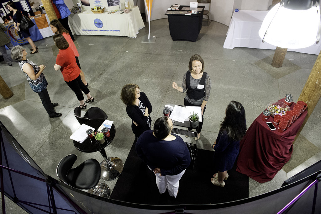 Shelley Kruszewski of the Androscoggin Land Trust chats Thursday with Amanda Methot, right, Christine Mumau, bottom, and Sheri Buck, all with the city of Auburn, during the LA Metro Marketplace in the Bates Mill Atrium in Lewiston. (Daryn Slover/Sun Journal)
