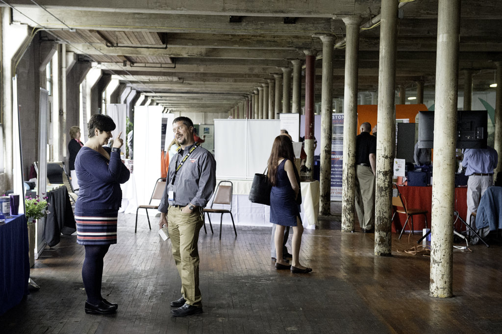 Christine Bosse of Bangor Savings Bank chats Thursday with Mike Mathieu of Neokraft Signs, during the LA Metro Marketplace in the Bates Mill Atrium in Lewiston. (Daryn Slover/Sun Journal)