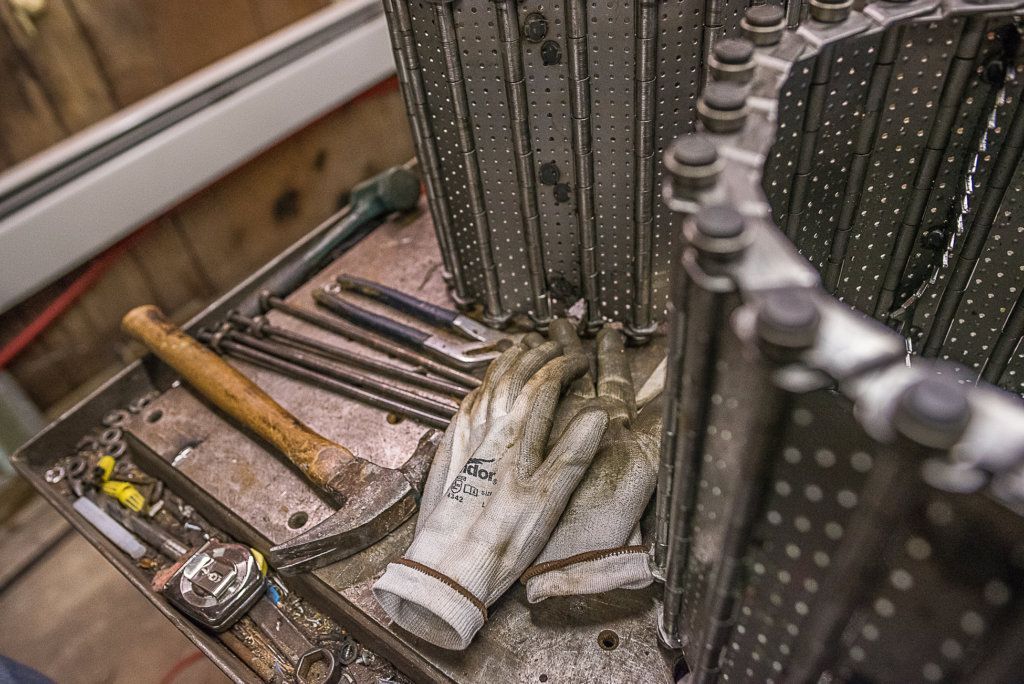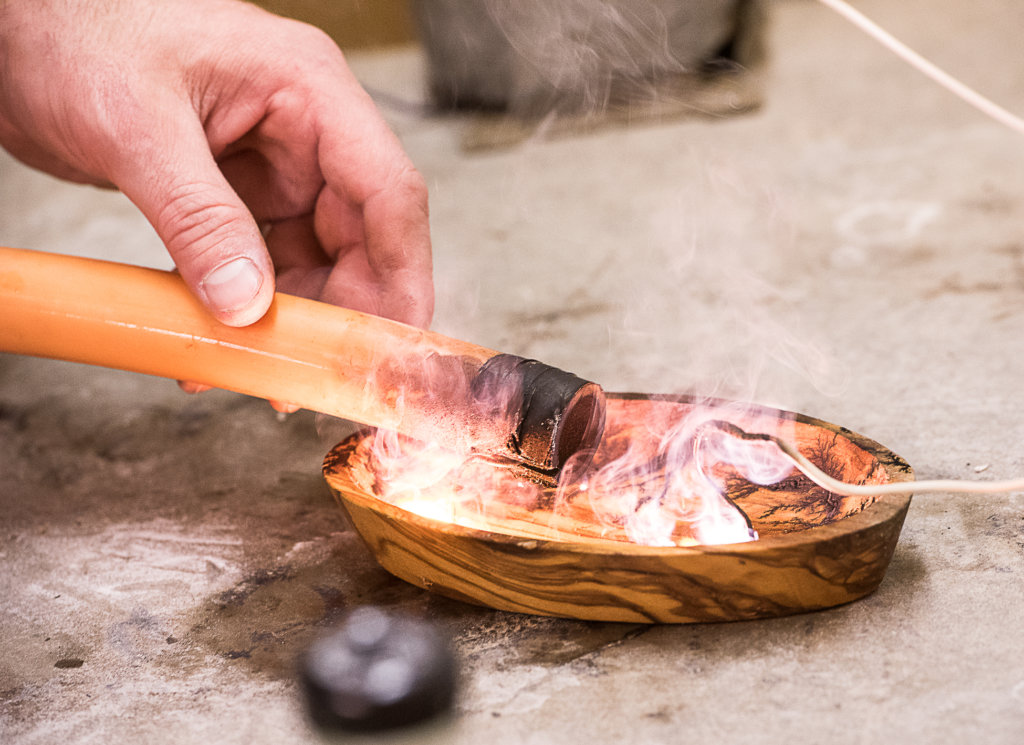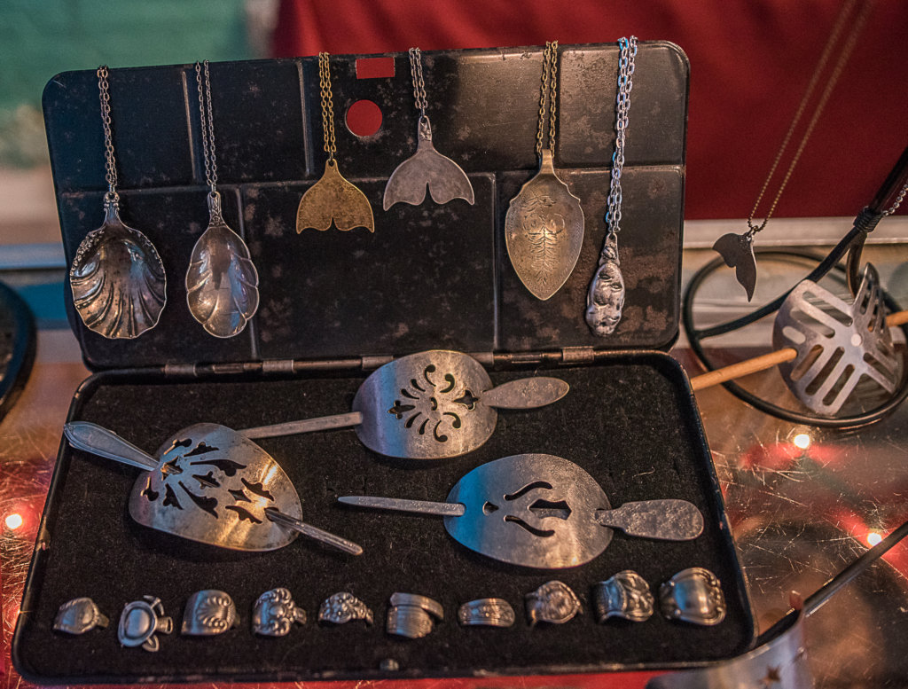 These days, their collaborations are industrious without the death-defying elements. Using mostly found or scavenged objects, they’re making tables, chairs and lamps out of wrenches, gears and braided wires. They’re electrifying ax handles and wooden bowls to create oddly beautiful effects, and they’re turning Grandma’s vintage silverware into wearables.
