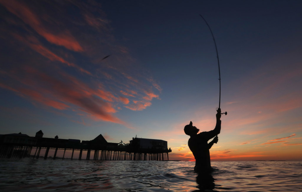 Sterling Pelsue, of Vergennes, Vermont, casts for striped bass in hip-deep water at sunrise near the Palace Playland amusement park, Friday, Aug. 31, 2018, in Old Orchard Beach. Pelsue got an early start to the Labor Day weekend, taking advantage of the return of pleasant weather following several days of hot and humid conditions. (AP Photo/Robert F. Bukaty)