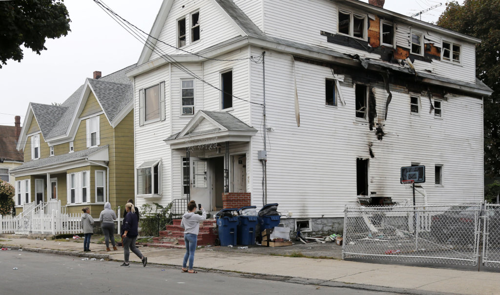 The house owned by Lawrence Police Officer Ivan Soto sits nearly burned to the ground on Jefferson Street, in Lawrence, Mass., Friday, Sept. 14, 2018. It was one of multiple houses that went up in flames on Thursday afternoon after gas explosions and fires triggered by a problem with a gas line that feeds homes in several communities north of Boston. After rushing home to check on his family and warn his neighbors to evacuate, Soto went back on patrol while his house was burning down. (AP Photo/Bob Salsberg)