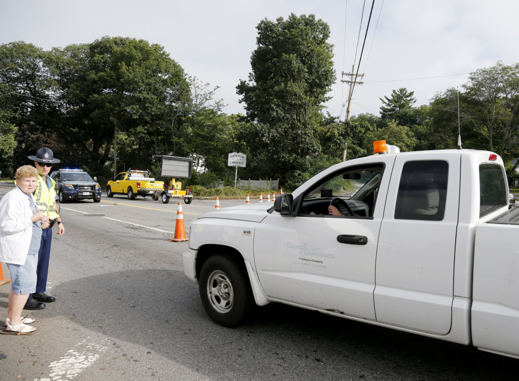 A Columbia Gas truck passes through a roadblock as a member of the State Police talks to a pedestrian on Route 114 in North Andover, Mass., at the Lawrence city line, Friday, Sept. 14, 2018. Many roads remain closed after Thursday afternoon gas explosions and fires triggered by a problem with a gas line that feeds homes in several communities north of Boston. (AP Photo/Mary Schwalm)
