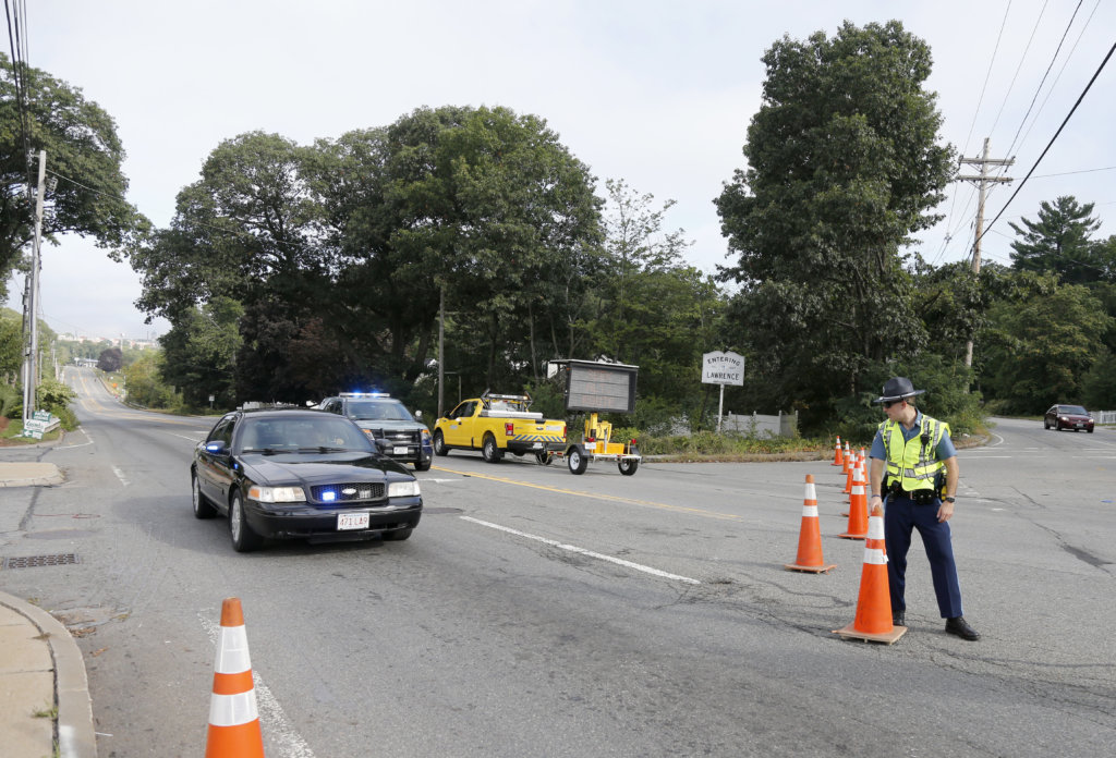 A member of the State Police moves a cone for an emergency vehicle at a road block on Route 114 in North Andover, Mass., at the Lawrence city line, Friday, Sept. 14, 2018. Many roads remain closed after Thursday afternoon gas explosions and fires triggered by a problem with a gas line that feeds homes in several communities north of Boston. (AP Photo/Mary Schwalm)