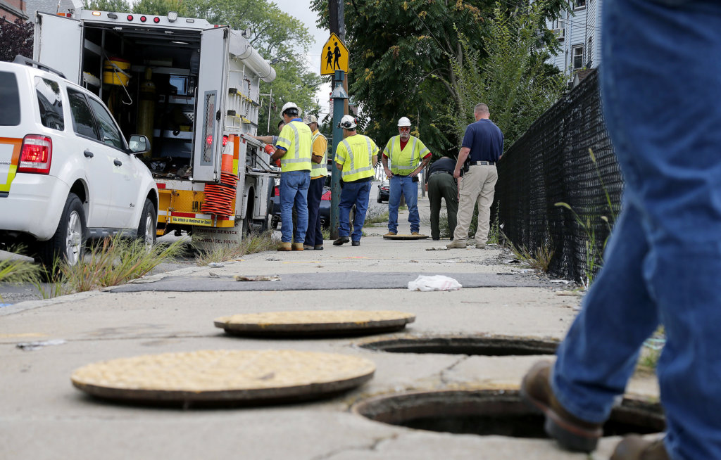 A worker with Columbia gas stands over an open man hole as the crew works to make sure there are no gas leaks at the corner of Parker and Salem Streets in Lawrence, Mass., Friday, Sept. 14, 2018. Multiple houses were damaged Thursday afternoon from gas explosions and fires triggered by a problem with a gas line that feeds homes in several communities north of Boston. (AP Photo/(AP Photo/Mary Schwalm)