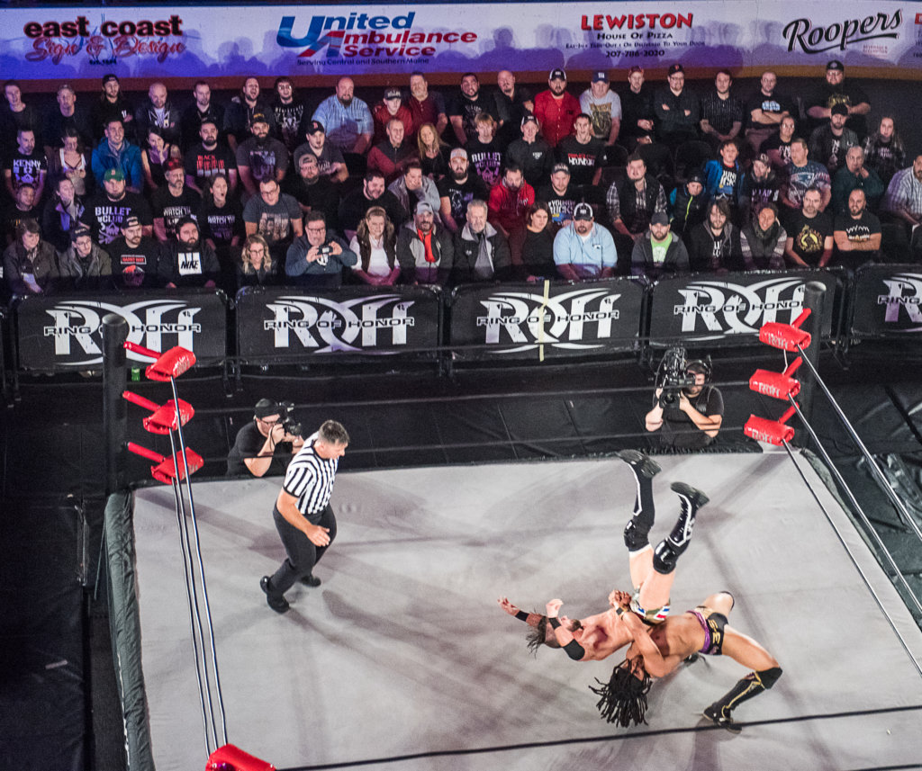 “It’s an old-school, roughhouse type of performance,” said Rick Cavallero, who came from South Paris with a pair of friends. “It really goes back to telling a story back and forth in the ring. It’s not going to end with someone running into the ring and interfering. When they agree to a ring of honor rule match, you know it’s going to end in a pinfall or submission.”