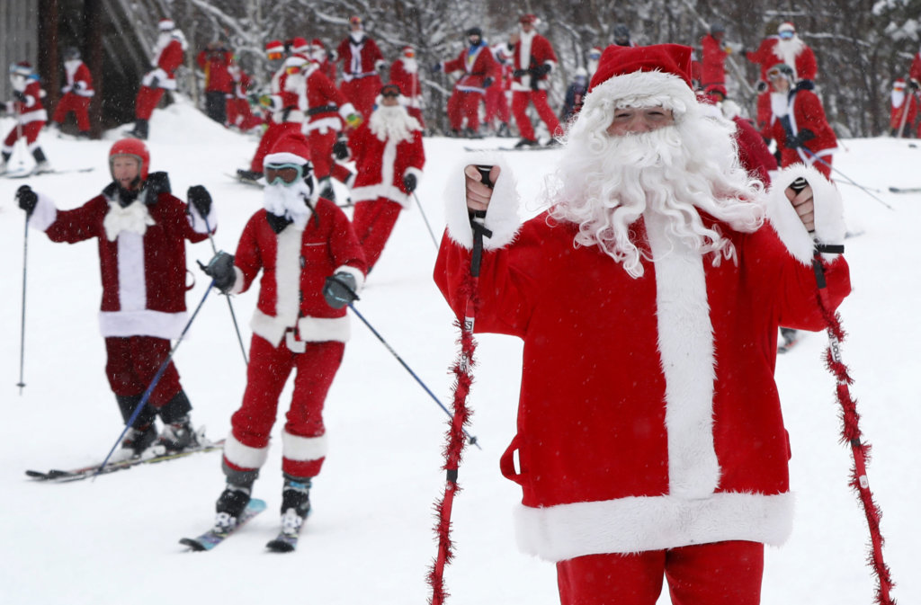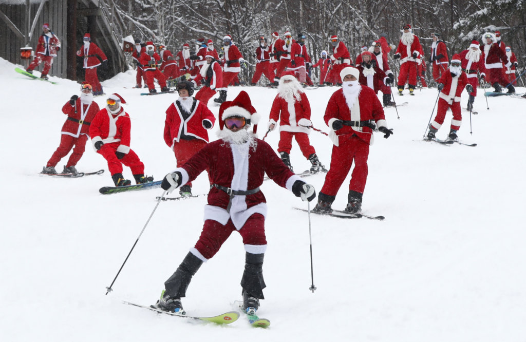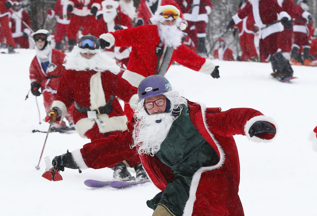 Skiers and snowboarders dressed as Santa Claus hit the slopes en masse during the annual Santa Sunday event, Sunday, Dec. 2, 2018, in Newry, Maine. The red-suited lookalikes aim to put a smile on people’s faces while raising money for charity. (AP Photo/Robert F. Bukaty)