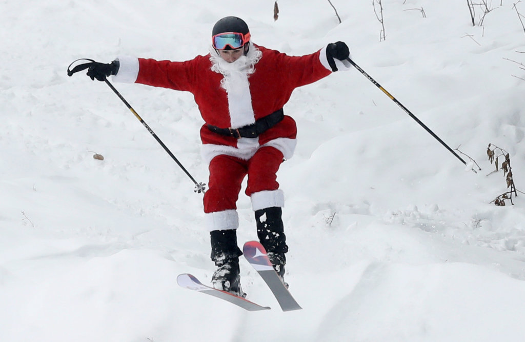 A skier dressed as Santa Claus takes flight during the annual Santa Sunday event, Sunday, Dec. 2, 2018, in Newry, Maine. The red-suited lookalikes aim to put a smile on people’s faces while raising money for charity. (AP Photo/Robert F. Bukaty)