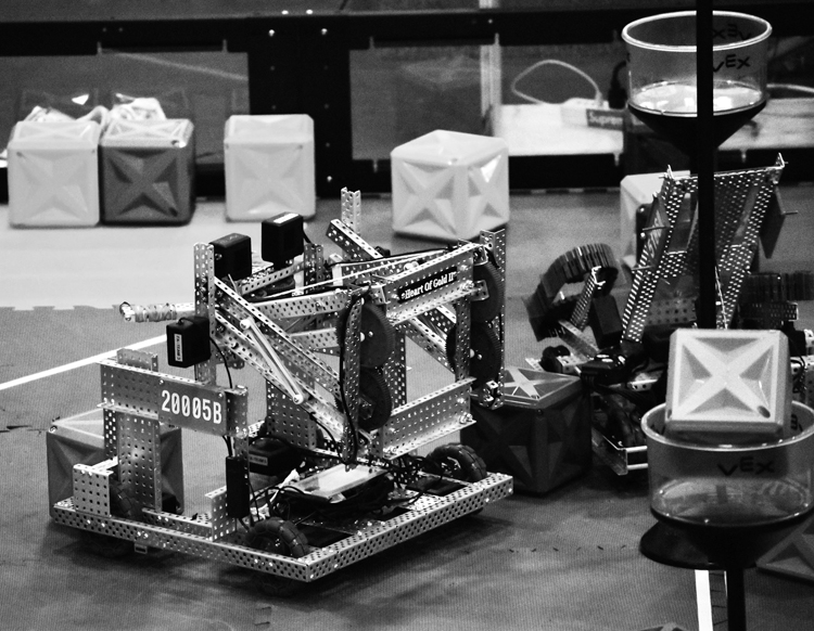Fryeburg Academy’s #20005B: Heart of Gold II robot built by Graham Scenstrom, Kaia Staples, Aaron Zakon and Andrew Day attempts to place cubes into the towers for points.