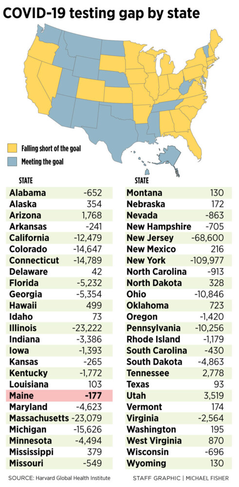 In mid-April, Maine was conducting about 406 tests a day, state data show. Harvard researchers say Maine should be testing, on average, 583 people a day if it hopes to safely track and contain the virus as it relaxes its social distancing requirements.