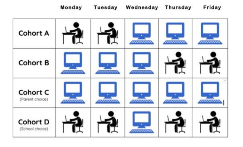 Some students who have special circumstances or learning needs will attend classes in person four days each week as Cohort D. The students in this group will be determined by the school.