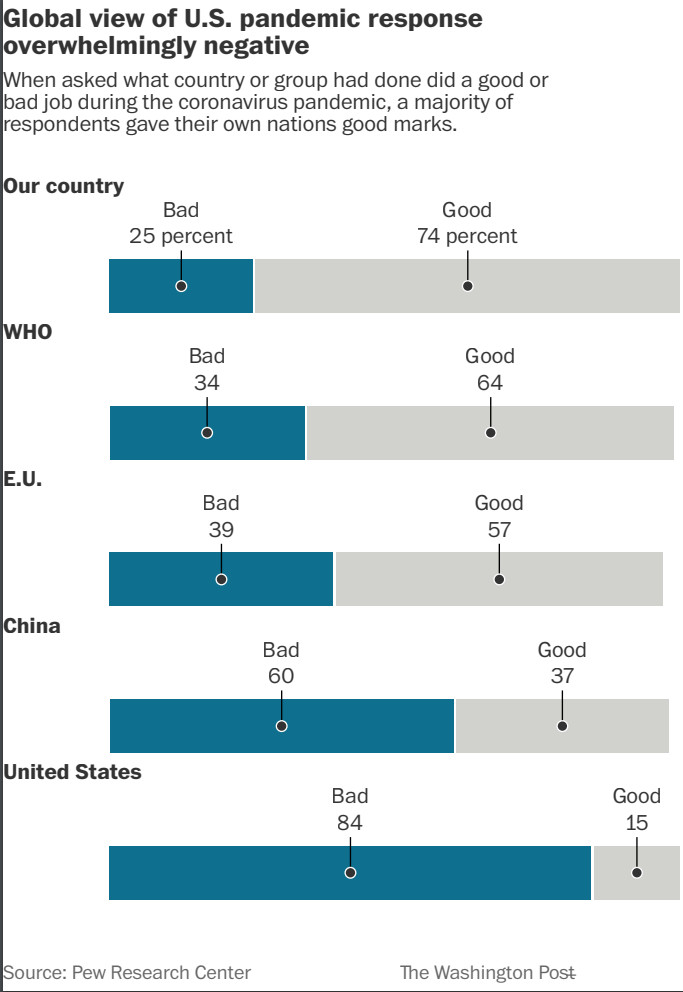 Internationally, the U.S. rating was significantly lower than the ratings for the World Health Organization, which the Trump administration has dubbed “corrupt,” and China, the epicenter of the initial outbreak, which Trump said “sent us the plague.”