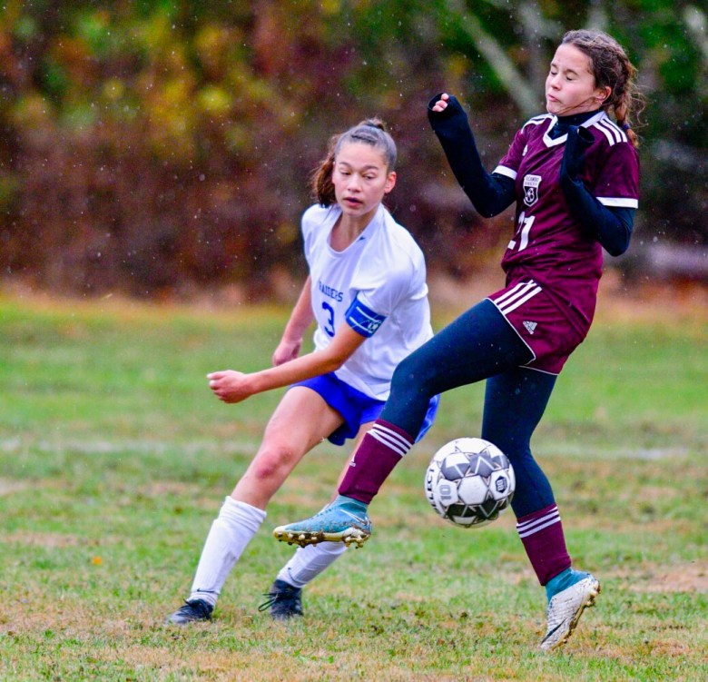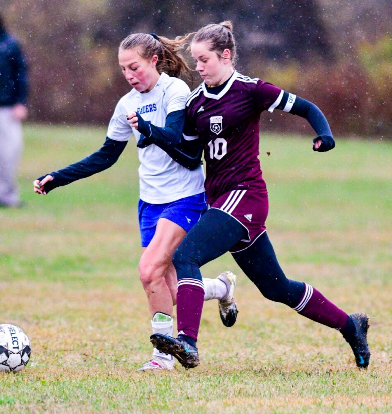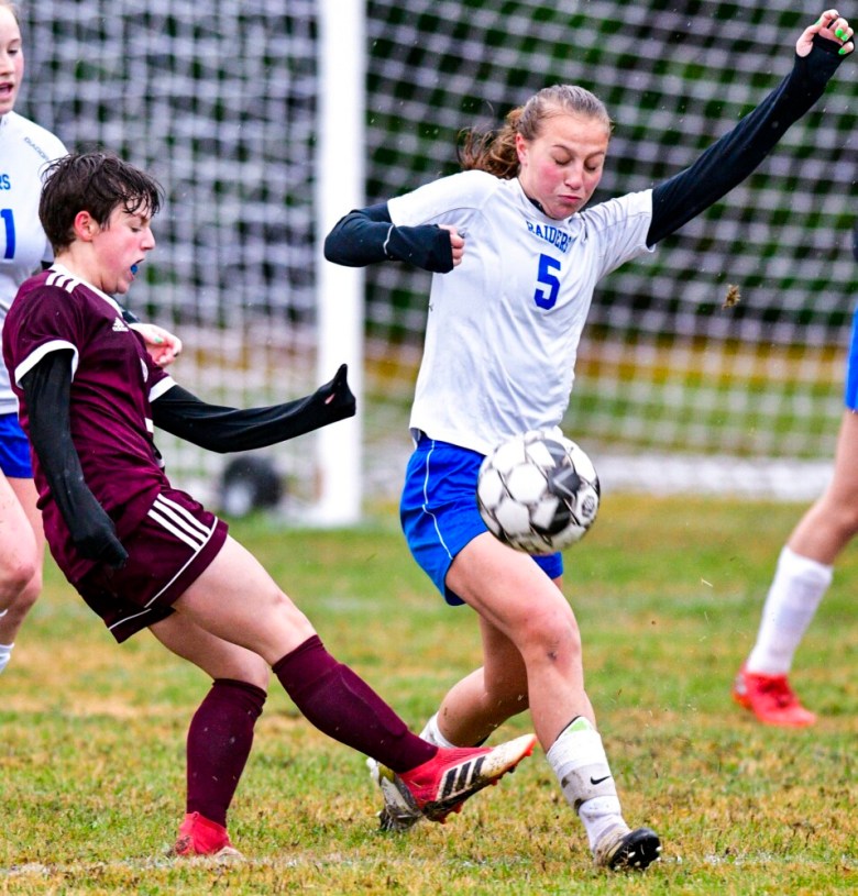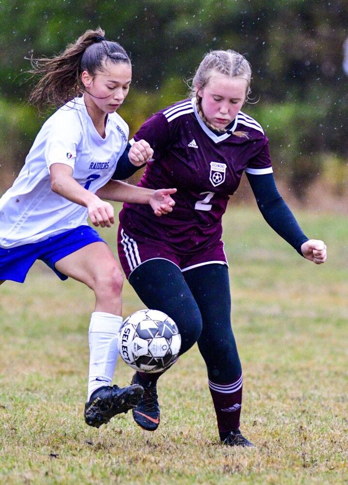Richmond’s Alana Hixon, left, and Oak Hill’s Emily Dillman, fight for the ball Thursday in Richmond. Joe Phelan/Kennebec Journal Buy this Photo