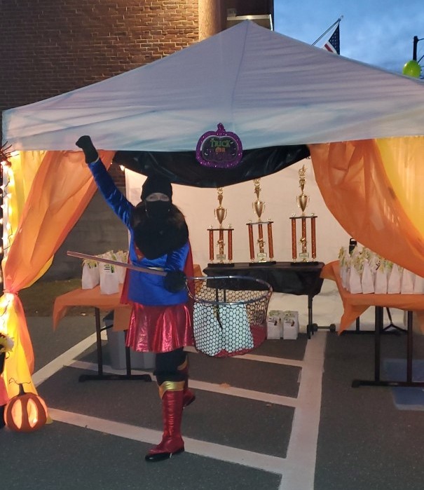 As families entered the Community Center parking lot, they were first greeted by 3D Games’ Pikachu mascot to go along with their ghostly trunk. Across from them was The Downtown Press Café’s panini press which was the full size of the trunk and was pressing a decorated sandwich that looked good enough to eat. Next was Salon West’s monster car that looked very hungry, especially because it was looking right at The Downtown Press Café’s panini. The next trunk was decorated by the Swept Clean Chimney Sweeps who appropriately decorated their trunk as a fireplace and chimney, and they were dressed for the job. The Orange Cat Café’s trunk correctly foretold the participants future by predicting that they will eat at their establishment soon. The next stop was at Hannaford’s trunk where viewers were drawn into their beautiful combination of Fall and Halloween decorations. Home Auto Group came next and their cast of ghosts and skeletons seemed to be carving up a human sized pumpkin. The serenading of Minikins then drew the attention of participants so another fortune could be told. This time the fortune predicted that participants would make sure to vote for Minikins to win the competition. Was their prediction correct? They then spent some time at E.L. Vining’s graveyard themed trunk, which seemed fitting the day before All Hallows’ Eve. Java Joe’s caffeine then woke us from the dead to explore their haunted house themed trunk. Kyes Insurance brought protection from all the ghouls and ghosts with a Ghostbusters themed car decked out and ready if needed. Robin’s Flower Pot then gave them a look into what a Fairy’s Forest might look like in the Fall. The Town of Farmington added their own trunk to the festivities themed as Stranger Things. Wicked Good Candy Company switched things up a bit and had them take a ride under the sea with an ocean themed trunk. Hight Chevrolet caught viewers by surprise with their ghoulish design fully equipped with an ejecting goblin coming through the curtain. The Roost then took them to the farm to see the chicks and chickens while Franklin Savings Bank introduced them to Goldie Locks and the Three Bears. The Franklin County Children’s Task Force showed off their collection of stuffed animals and Reny’s danced through their spooky adventure design to end the parade of trunks. To finish everything off, our very own Supergirl (Jennifer Savage) passed out bags of pre-packaged, contact-free candy to children using a fishing net.