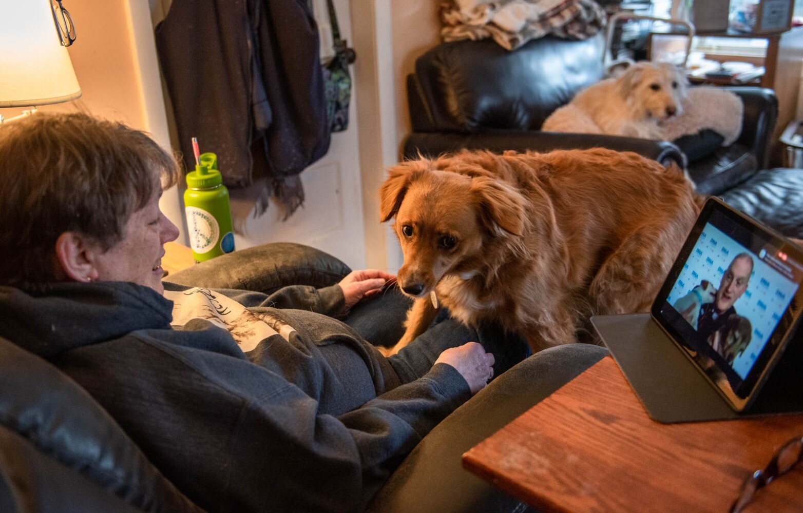 Carolyn Bloom watches the Delaware Humane Society “Indoguration” for President-elect Joe Biden’s dog, Major, on an iPad at her house in Auburn on Sunday afternoon. The event was a fundraiser to honor Major as the first shelter dog to reside at the White House. Bloom’s dogs Josie, in her lap, and Remus, in background, joined her for the show. Bloom says she is a lifelong Democrat. Andree Kehn/Sun Journal Buy this Photo