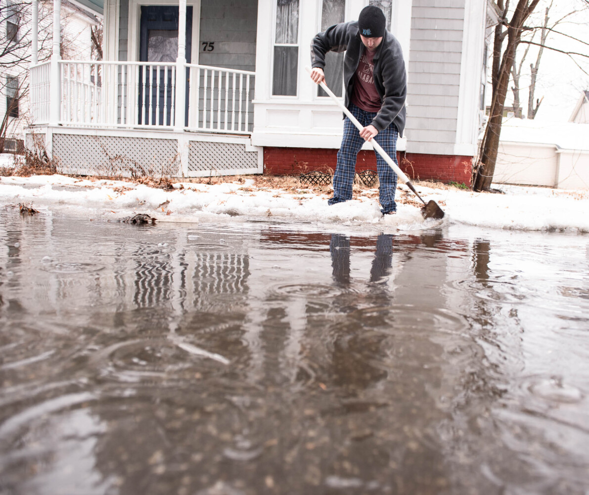 Brandon Hatch clears the storm drain near his home on High Street in Auburn in Saturday during a heavy rain. “It backs up too much, so I have to do this,” Hatch said. Andree Kehn/Sun Journal Buy this Photo