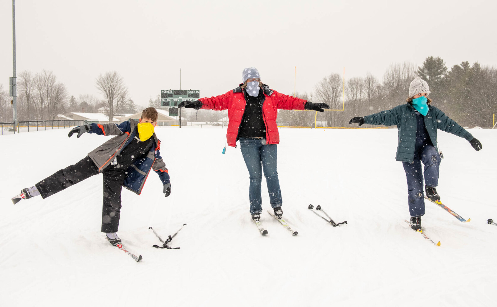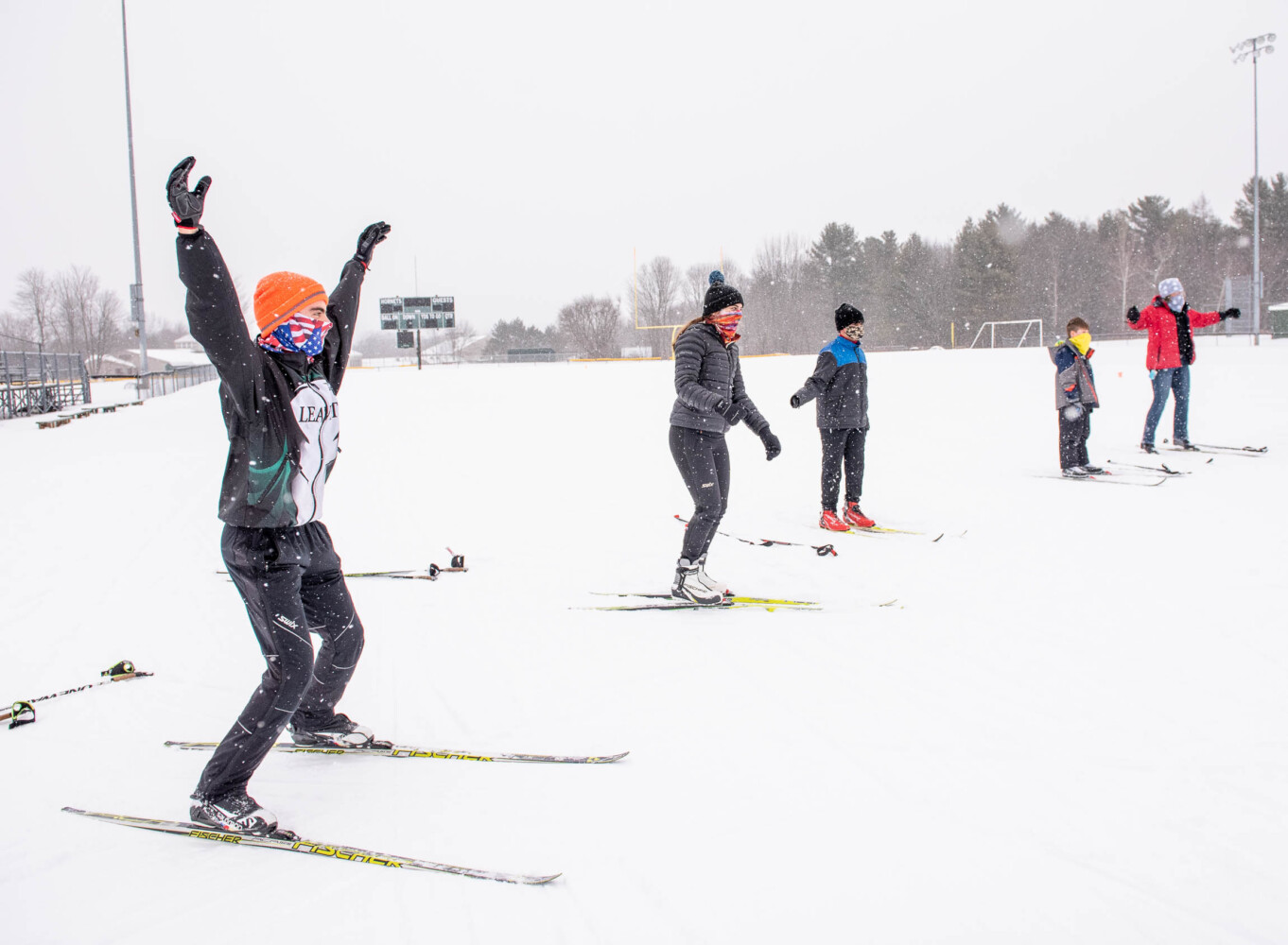 Dominick Toscano, left, participates in a jumping jack warm-up Sunday at the Leavitt Area High School’s Nordic Ski Program in Turner. The program aims to teach children the fundamentals of cross country skiing and is run by high school students and recent alumni. Andree Kehn/Sun Journal Buy this PhotoAmy Mahar, center, and two of her children, Philip, left and Leah, balance on one ski during a warm up exercise at Leavitt Area High School on Sunday. The free Nordic Ski Program, designed for kids, was run by current ski team members and alumni to teach the fundamentals of cross country skiing. Andree Kehn/Sun Journal Buy this Photo