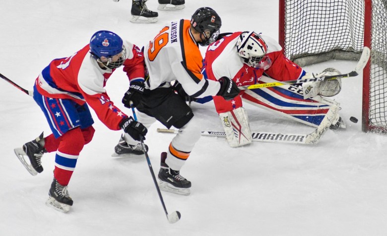 Mt. Ararat’s fourth power play effectively iced the game. Moments after the Eagles’ Brandon Durant had a shot hit off the post, an airborne puck floated over a Mt. Ararat defenseman and into open ice. Camdyn Lasselle gathered it and went in alone, and although Sean Moore stopped his initial shot, the puck stayed with Lasselle, and slipped it over to a trailing Luiz for the easy goal and a 3-0 lead with 14:18 to go.