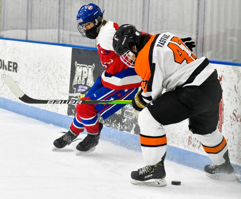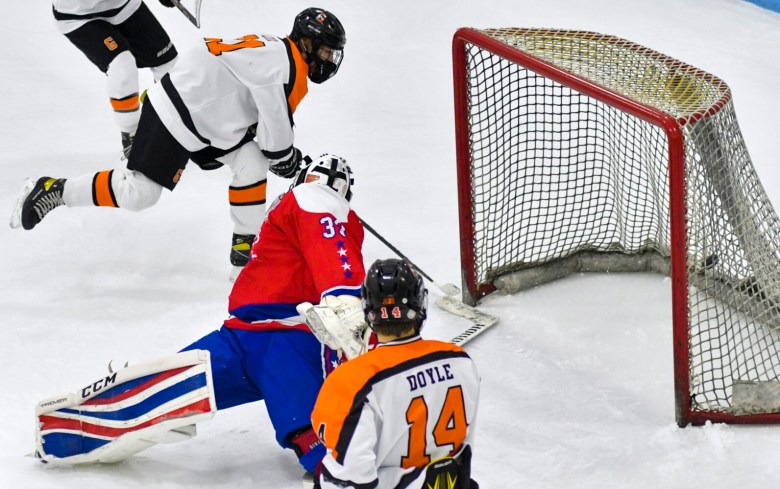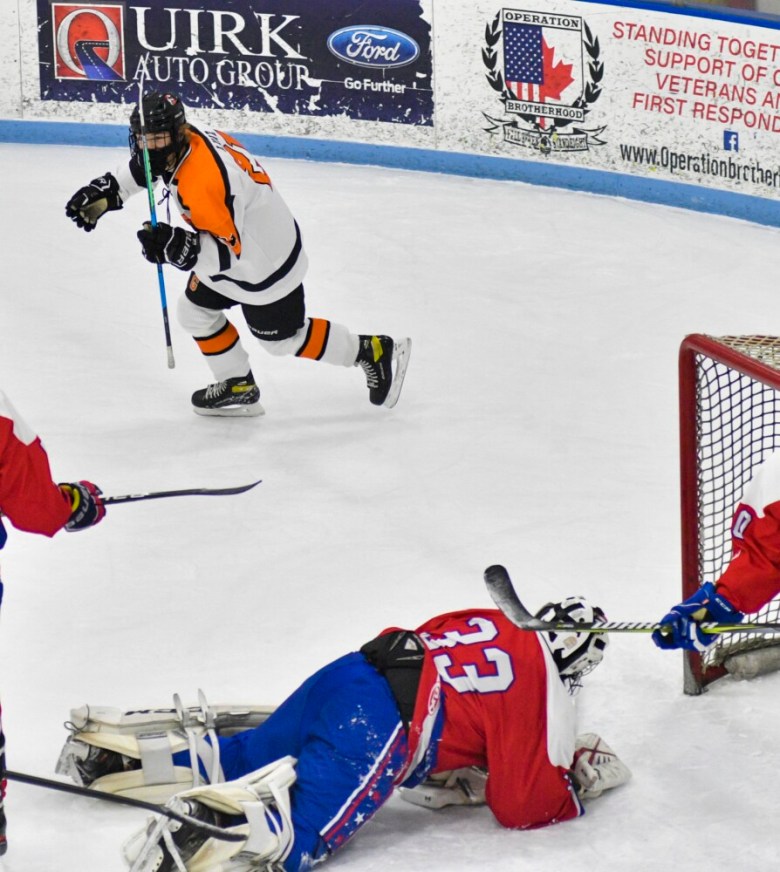 Mt. Ararat’s fourth power play effectively iced the game. Moments after the Eagles’ Brandon Durant had a shot hit off the post, an airborne puck floated over a Mt. Ararat defenseman and into open ice. Camdyn Lasselle gathered it and went in alone, and although Sean Moore stopped his initial shot, the puck stayed with Lasselle, and slipped it over to a trailing Luiz for the easy goal and a 3-0 lead with 14:18 to go.