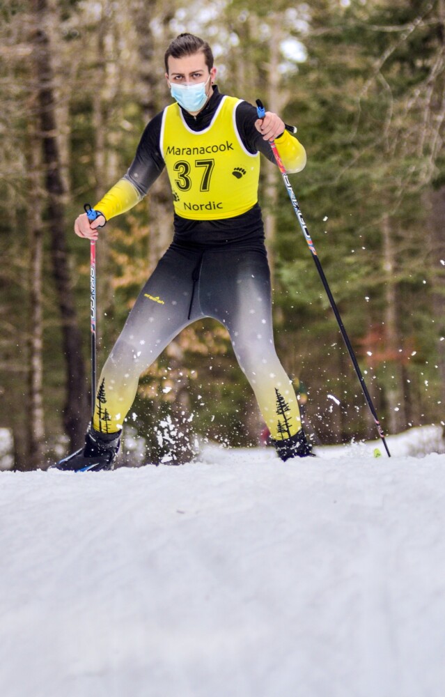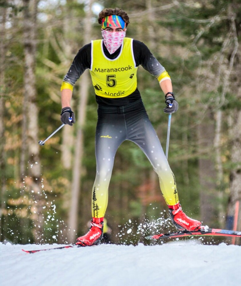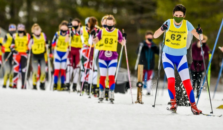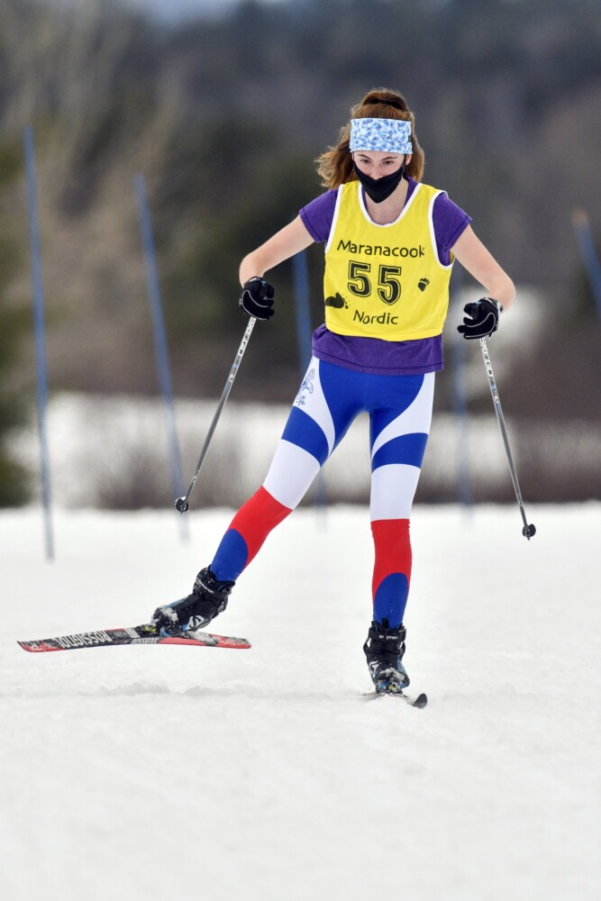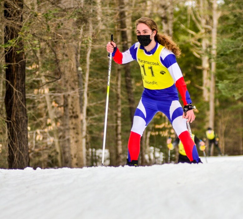 The venue added to what was an unusual day in an unusual year. Maranacook, which hosts meets each year but usually doesn’t have enough snow to hold them at home, this time got to have a race in its backyard. Temperatures reaching the mid-to upper-40s saw skiers in short sleeves in February. And, of course, there were the masks, a permanent reminder of the pandemic in which all of this was taking place.